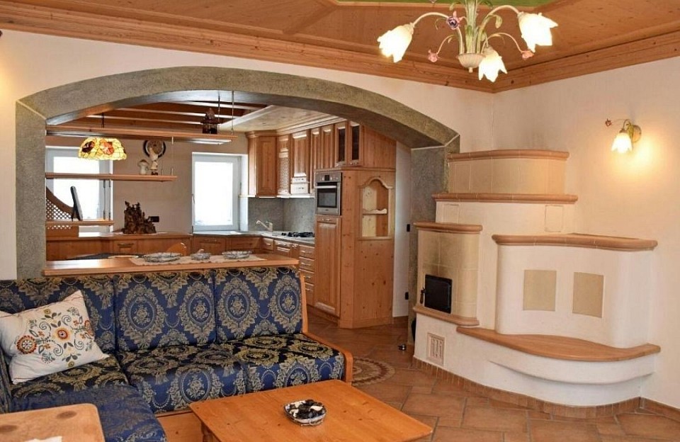 🤍 Cucina combinata con soggiorno, tipica stube di montagna, divano letto, radio e tv a schermo piatto. Completamente attrezzata con lavastoviglie, forno tradizionale e a microonde, frigo, congelatore, moka, macchina del caffè e bollitore